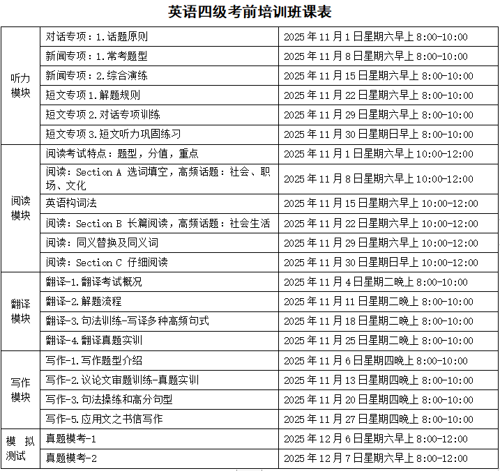 英语作为国际交流的重要工具,在教育和职业发展中扮演着越来越重要的角色。大学英语四、六级考试(CET-4/6)不仅是衡量大学生英语水平的重要标准,也是许多企事业单位招聘时参考的重要指标之一。 为帮助广大学生顺利通过大学英语四、六级考试,提升英语综合应用能力,必赢网投特别推出“大学英语四、六级考前培训班”。该项目旨在为应考学生提供系统化、个性化的学习方案,为顺利通过考试助力。 【培训目标】 帮助学员掌握大学英语四、六级考试的核心知识点和解题技巧。 提升学员在听力、阅读、写作及翻译等各方面的应试能力。 助力学员备考大学英语四、六级,取得理想成绩。 【培训内容】 听力专项:强化训练,习得技巧,提升分数 阅读专项:打破传统,掌握方法,争取高分 写作专项:活用模板,巧用句型,优化结构 翻译专项:逻辑转换,转变思维,着重产出 测试点评:全真试题,定位短板,科学提升 【培训对象】 1.广西大学在读本科生和研究生; 2.南宁市内高校在读本专科生和研究生。 【培训方式】 线上线下混合教学:线上平台提供丰富的教学资源,方便学员随时复习和练习重点知识;线下课堂开展面授教学,包括知识点讲解、小组讨论、课堂练习等。 小班教学:每班学员控制在30人左右,确保教师能够关注到每位学员的学习情况,提供个性化指导。 【培训时间】 培训周期为5周,共48个课时,每次课50分钟。课程主要安排在周末及课余时间。计划2025年11月1日开课,12月7日结课。 【收费标准】 大学英语四级考前培训班:1580元/人/期。 大学英语六级考前培训班:1880元/人/期。 【联系方式】 咨询报名热线:0771-3235605 李老师 报名地址:必赢网投210办公室 咨询二维码 报名二维码