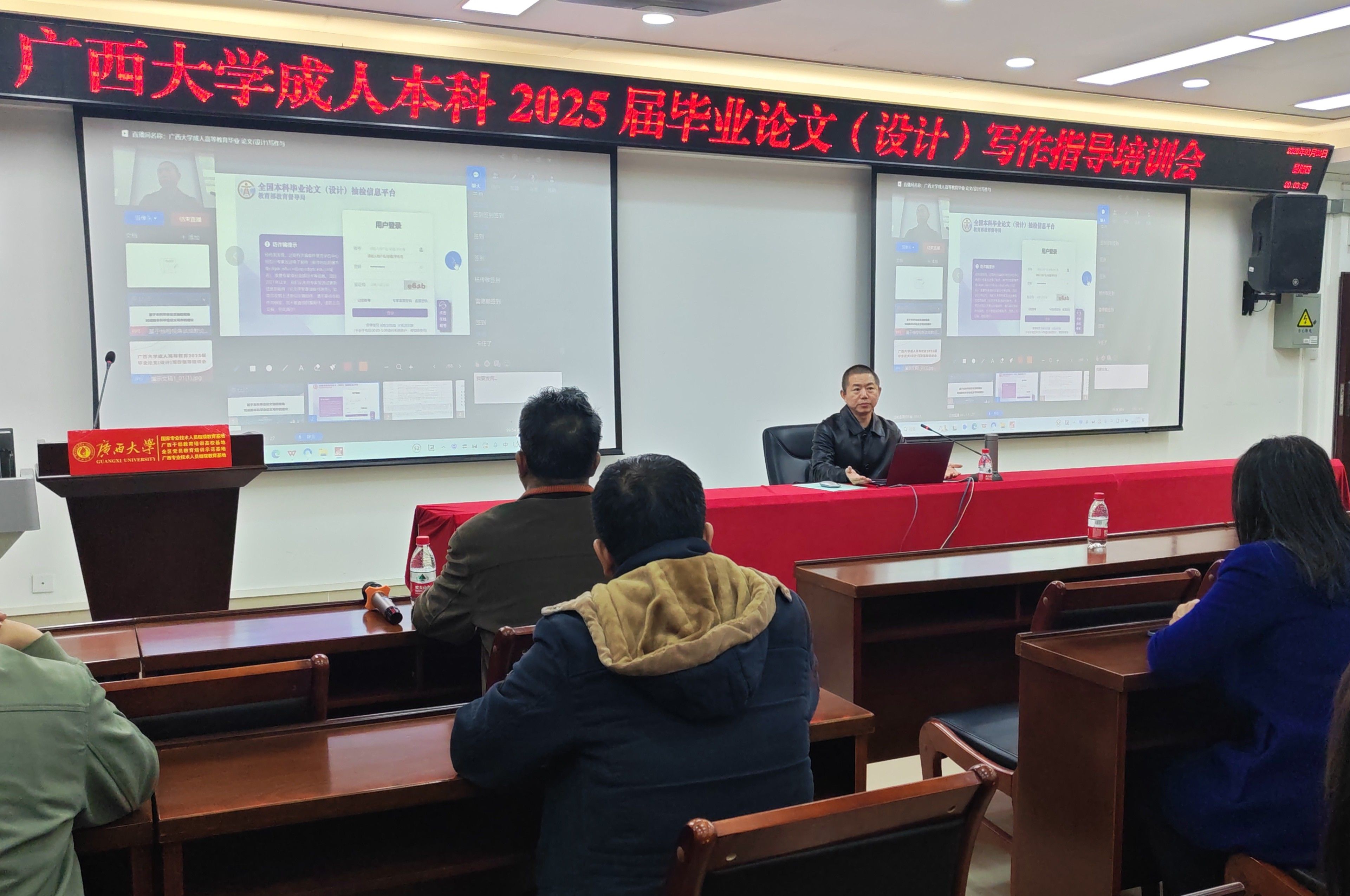 为强化我校成人本科毕业论文(设计)写作规范,提升学生毕业论文(设计)写作水平,我院于2025年3月6日晚举办了2025届成人本科毕业论文(设计)写作指导培训会。培训会由继续教育学院副院长谭鸿禹主持,我校教育教学质量监控与评价中心副主任、教学督导团副团长王恩界教授主讲,培训采用线下与线上同步直播相结合的形式举行,1200余名2025届成人本科毕业生参加了培训。