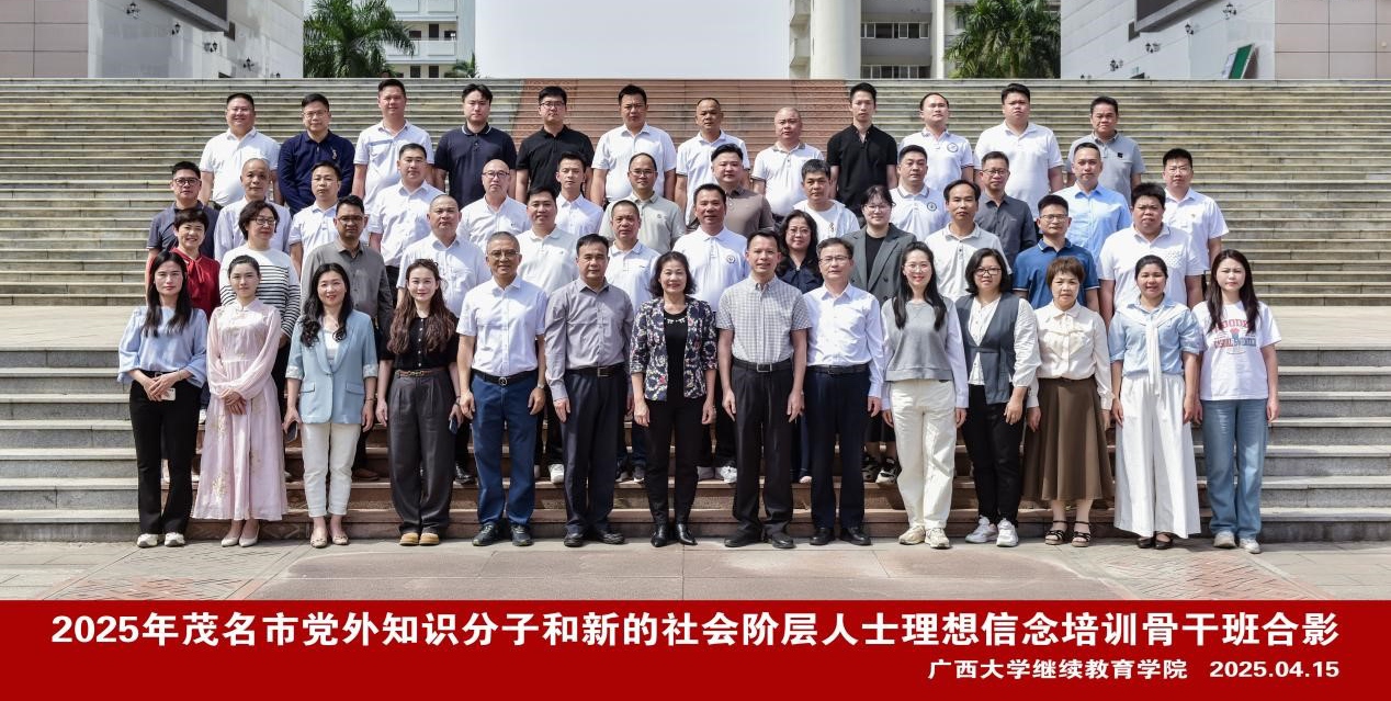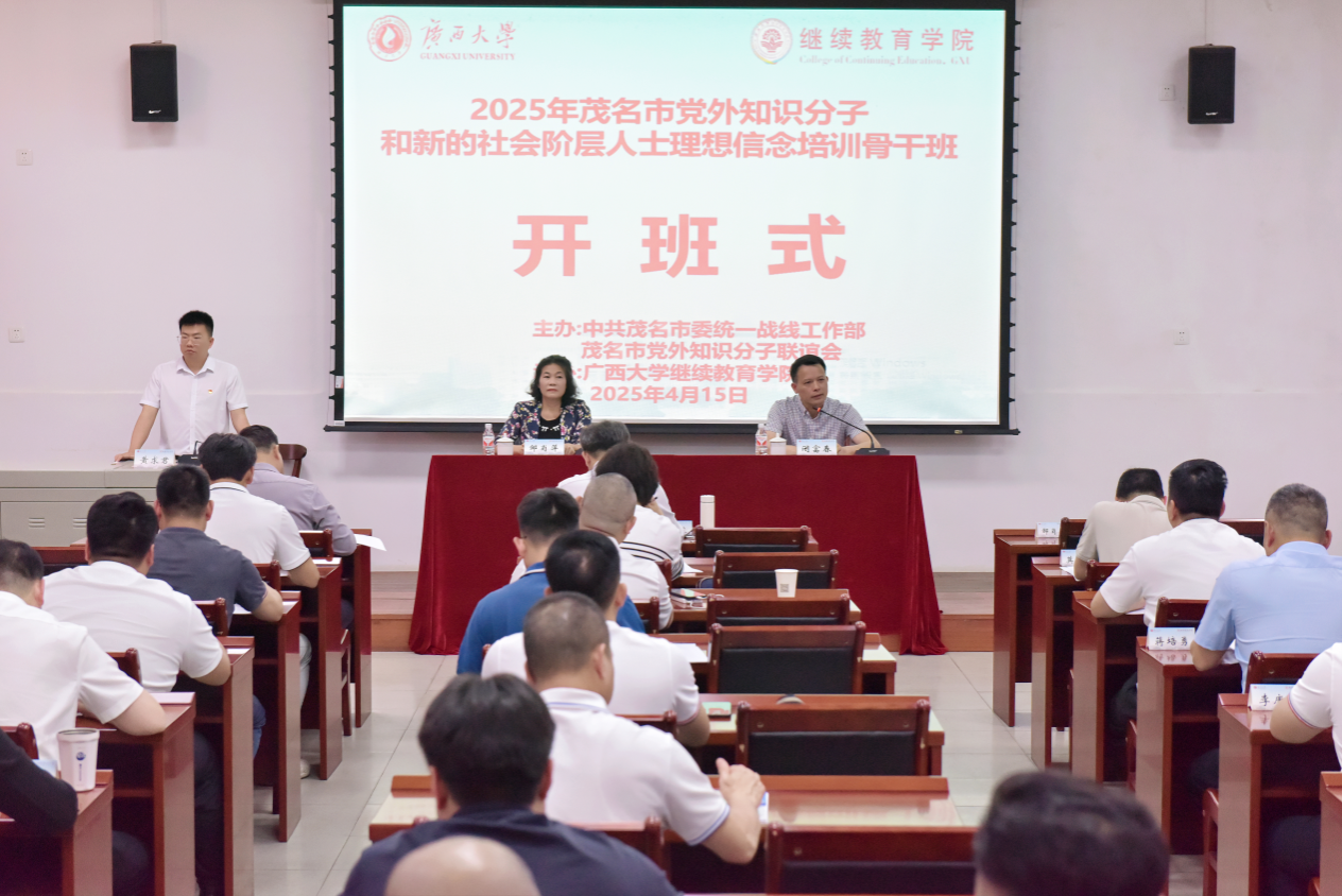 2025年4月15日,2025年茂名市党外知识分子和新的社会阶层人士理想信念培训骨干班在我校开班,茂名市委统战部二级调研员邹肖萍、必赢网投院长闭富春出席开班式。