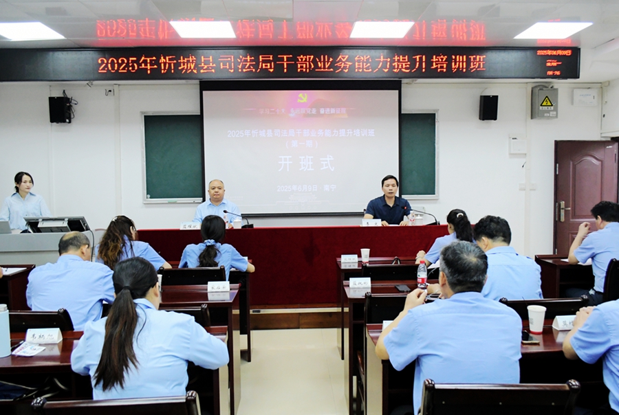 6月9日,2025年忻城县司法局干部业务能力提升培训班(第1期)在我院开班。忻城县司法局党组成员、副局长蓝耀斌出席开班式并作动员讲话,我院干部培训中心负责人出席开班式并致辞。