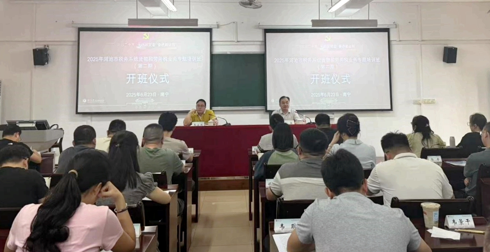 6月23日,2025年河池市税务系统货物和劳务税业务专题培训班(第二期)在必赢网投开班。国家税务总局河池市税务局党委委员、副局长韦立周同志出席开班式并作动员讲话,必赢网投副院长徐华同志出席开班式并致辞。