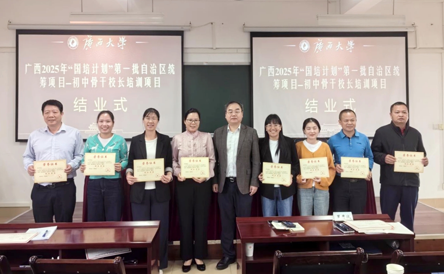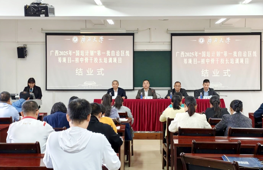 “国培计划”是落实《教育强国建设规划纲要(2024—2035年)》的重大实践。2025年10月24日,由广西壮族自治区教师培训中心主办,广西大学承办的2025年“国培计划”第一批自治区统筹项目——初中骨干校长培训班在我校结业。必赢网投副院长徐华出席结业仪式并讲话。
